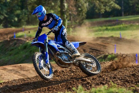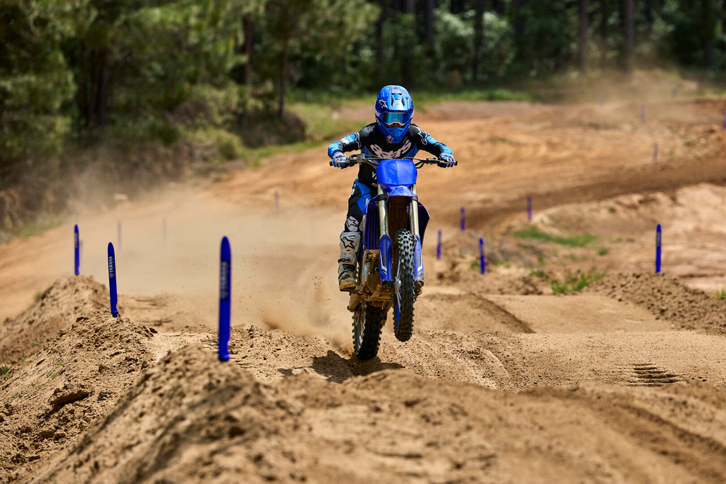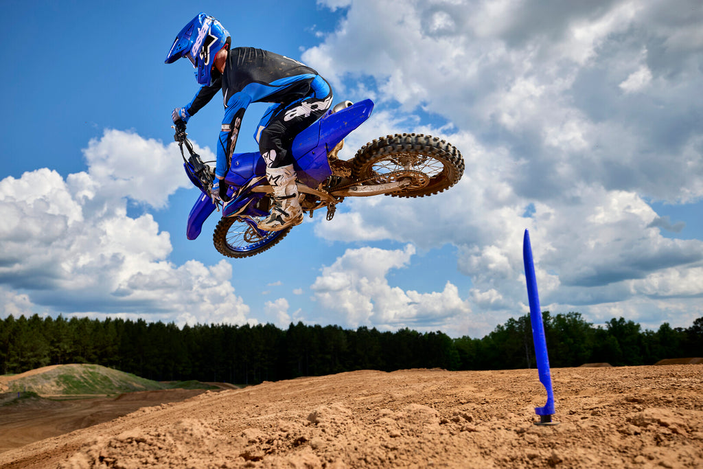 An aluminium bilateral beam frame based on the flagship YZ450F provides just the right amount of strength and flex for the perfect balance of stability and cornering performance. The result is a better handling machine with lightweight feel and increased front wheel traction, allowing the rider to enter corners with greater confidence and more line choices.